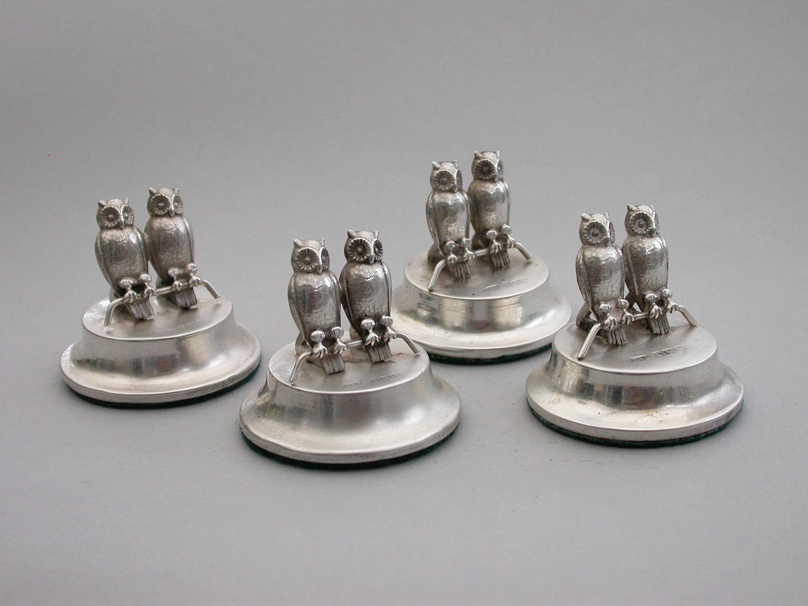 Set of Four Edwardian Silver Owls Menu Holders by Levi & Salaman, Birmingham, 1906 - 1907