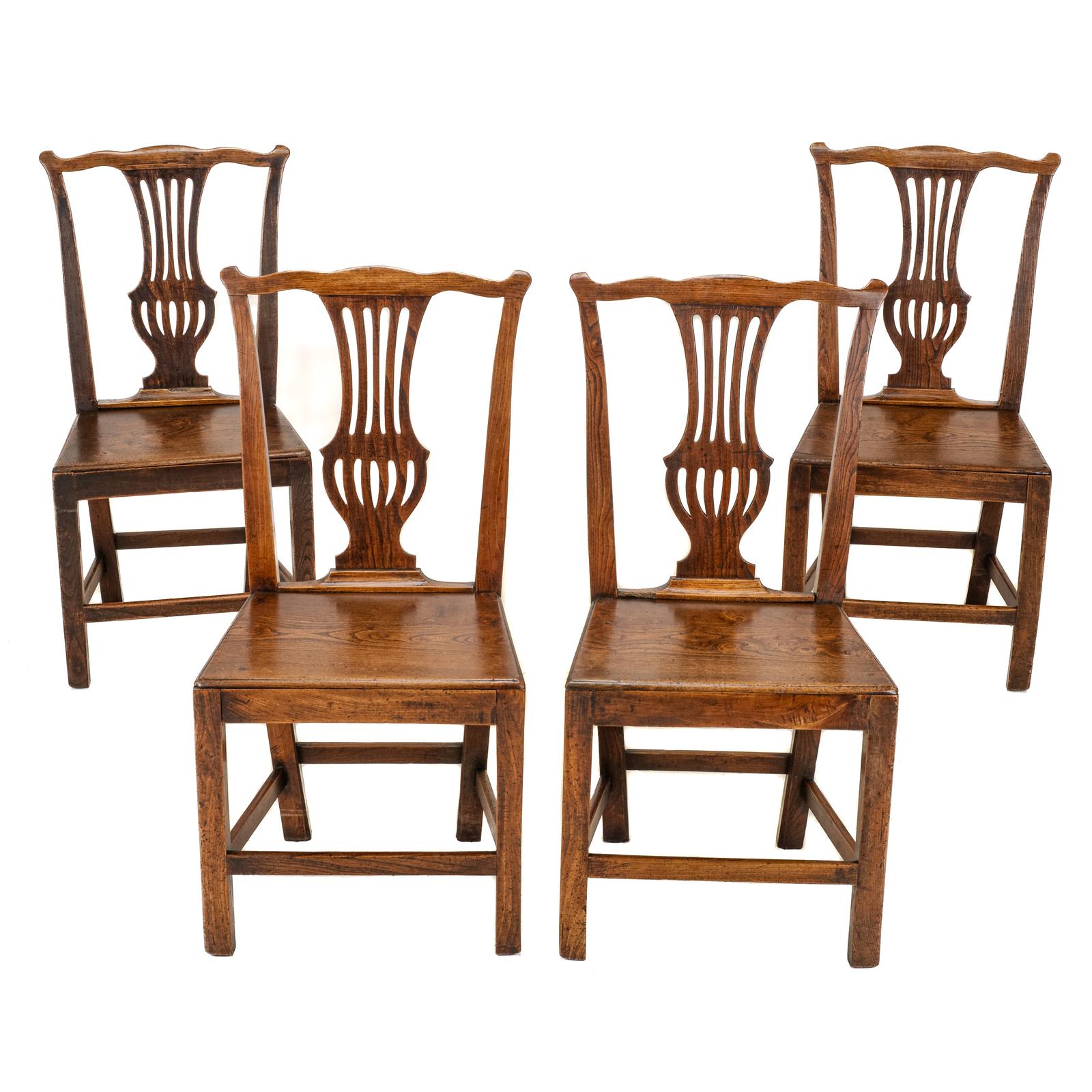 A particularly attractive and honest set of four Georgian elm dining chairs, dating from the late 18th century, George III period, circa 1770–1790. What makes this set especially appealing is the survival of all four chairs together, in matching form and condition, and without obvious later alterations or restoration — something that is increasingly uncommon with country chairs of this type, many of which have been mixed, strengthened, or rebuilt over time.
