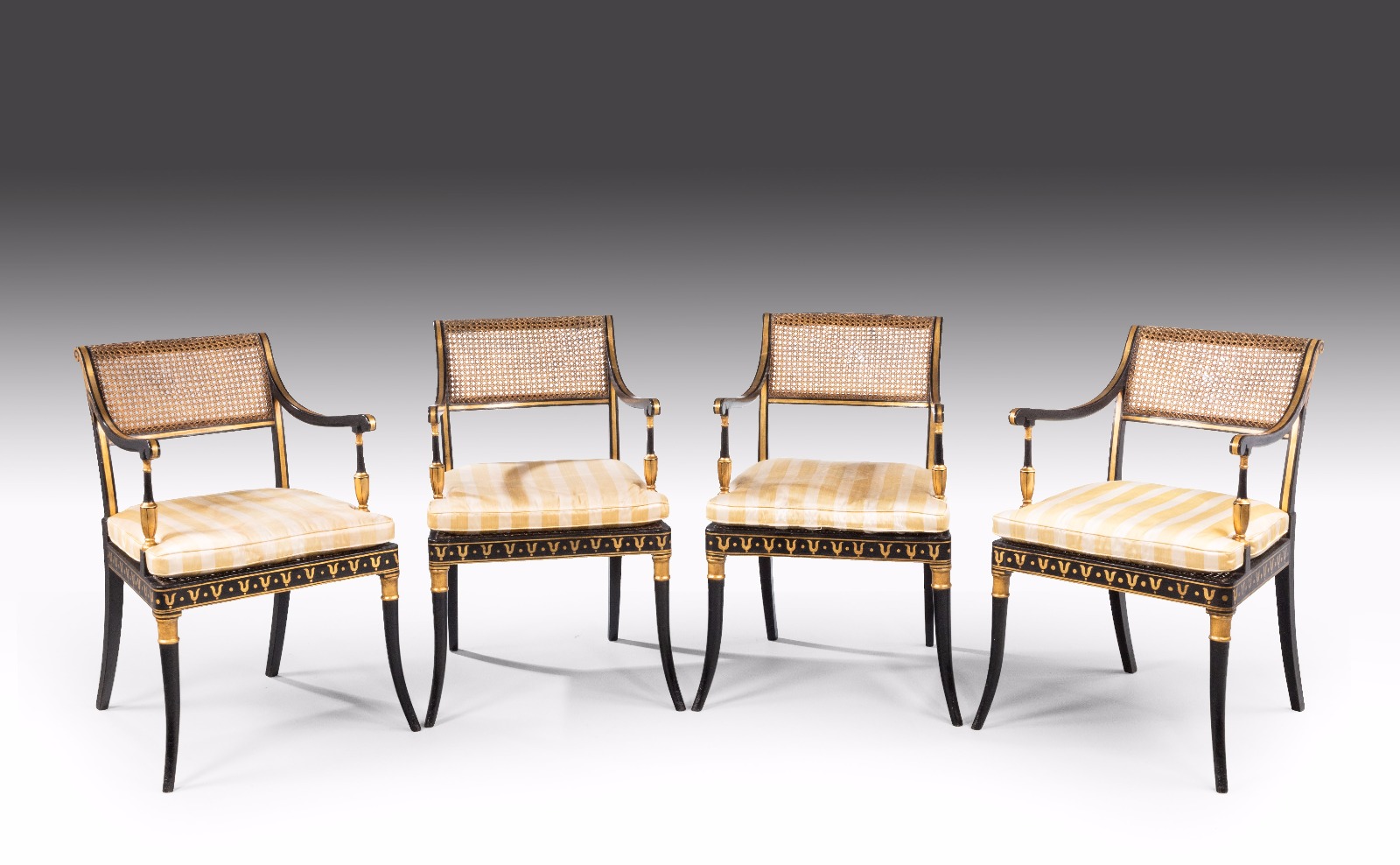 Set of Four Regency Period Lacquered & Parcel Gilt Elbow Chairs