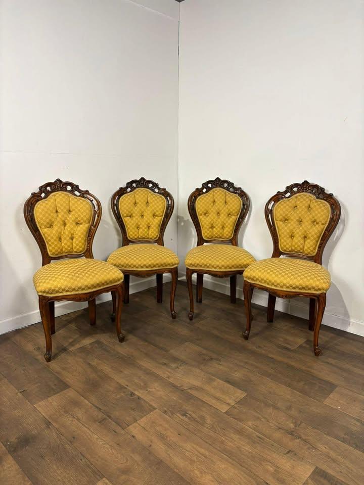 A decorative set of four vintage Italian-style dining chairs, crafted in walnut with elegant carved detailing throughout. The shaped backrests and carved legs give the chairs a refined and classical appearance, making them ideal for both traditional and eclectic interiors.