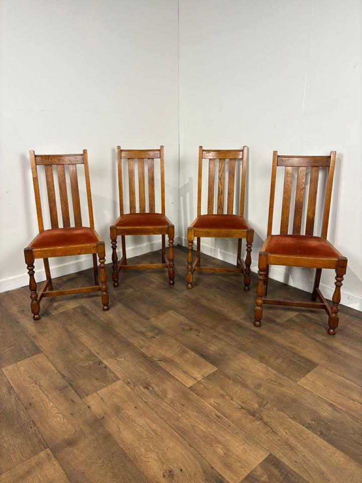 A charming set of four solid oak dining chairs, featuring warm natural tones and attractive grain throughout. Each chair is fitted with a burnt orange upholstered seat pad that adds a lovely splash of colour and comfort.
