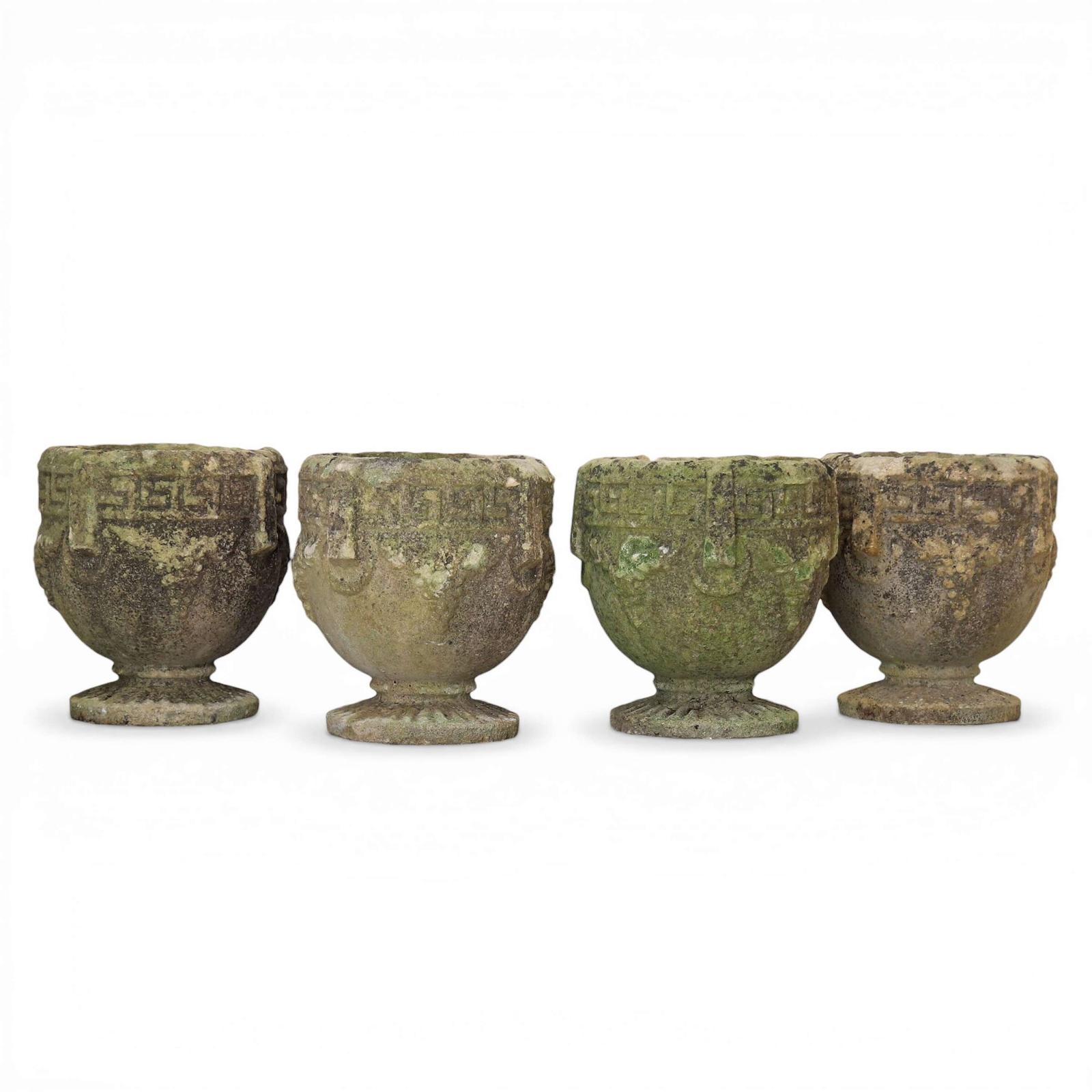 This elegant set of four urns, dating to the mid‑20th century, are cast in composite stone - a material valued for its durability and ability to weather gracefully outdoors. Inspired by classical forms and decorative language each urn features a Greek key moulded rim above a body enriched with grape and foliate detailing, lending depth and classical rhythm to the design. The castings retain enough crispness to show their classic geometric rim detail giving each piece a pleasing balance of age and definition.
