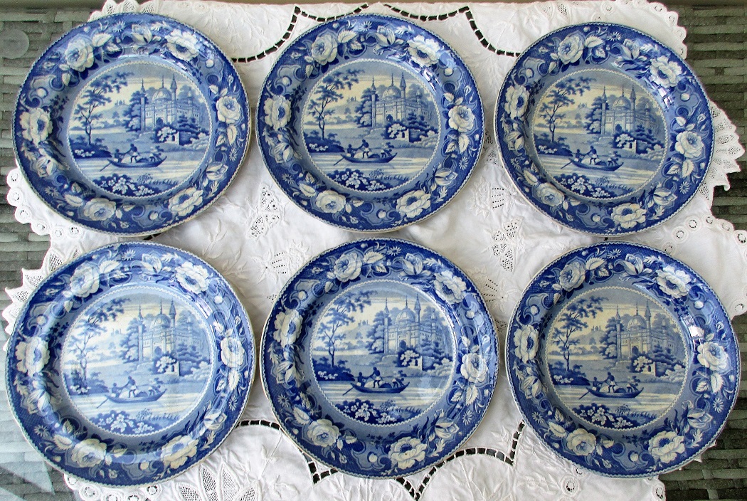 Set of Six Antique English Georgian Davenport Blue and White Transfer "Mosque and Fishermen" Pattern Pottery Plates