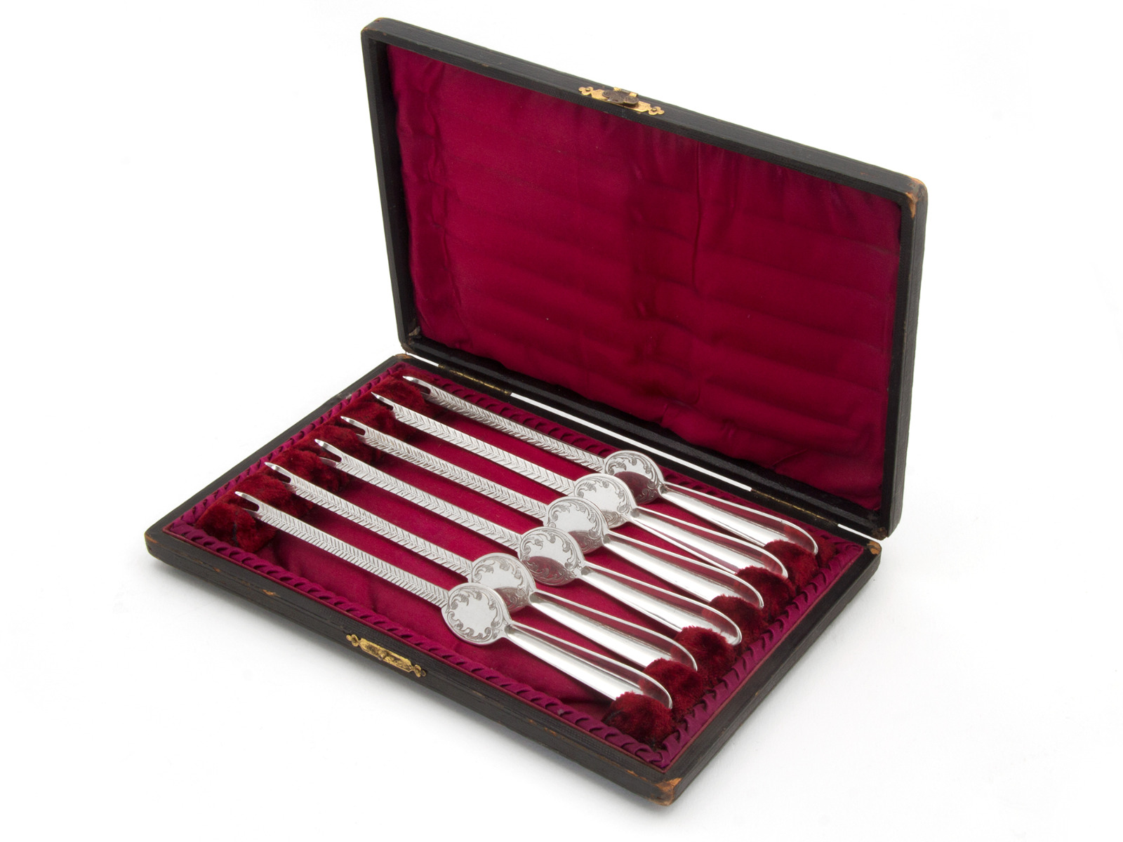 Set of Six Boxed Antique Silver Plate Lobster Picks