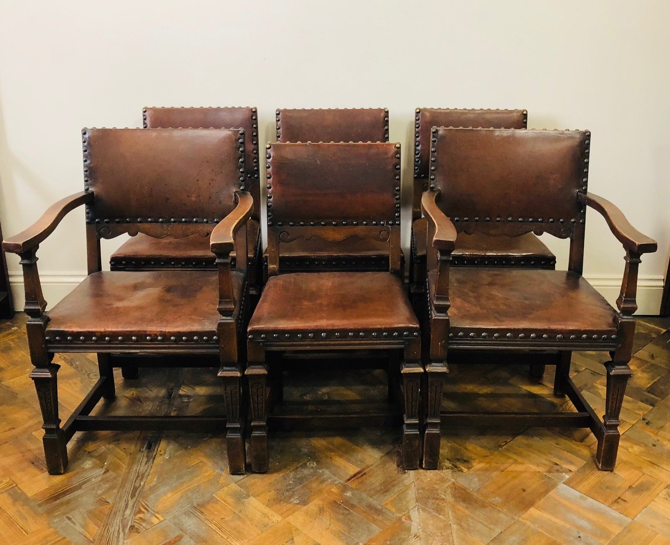 Set of Six Brown Leather Chairs Inc. Two Armchairs