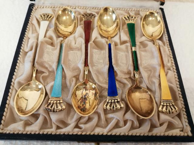 Set of Six Danish Enamel & Silver Gilt Spoons