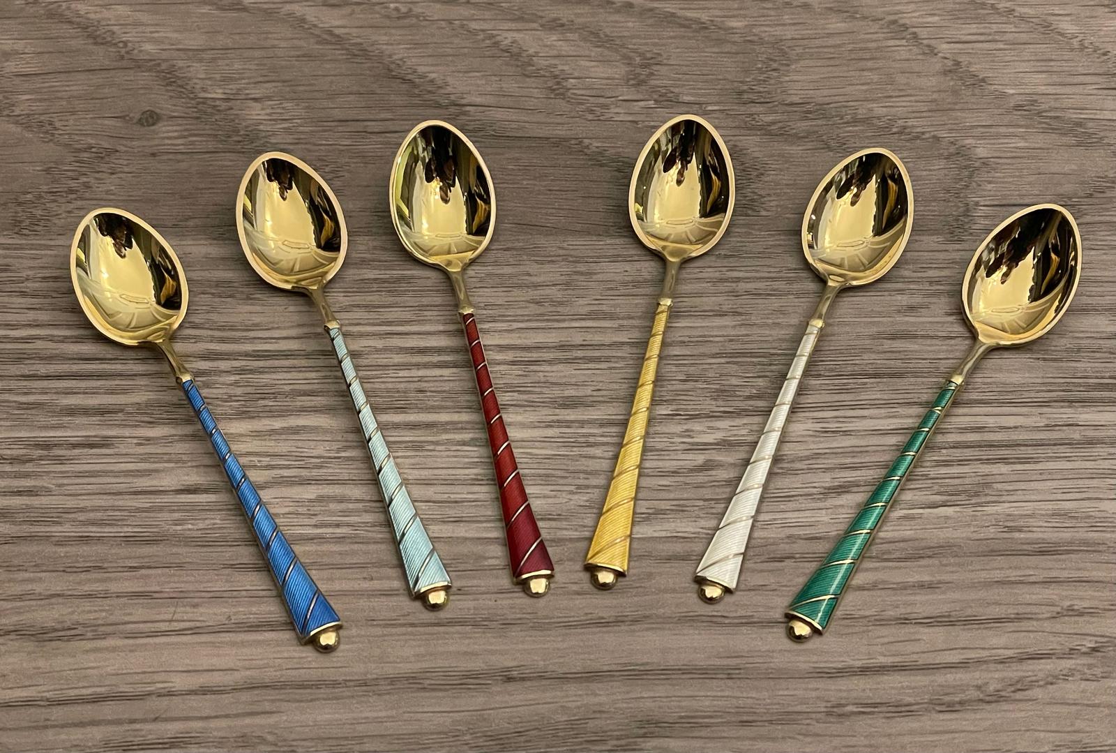Set of Six Danish Silver Gilt Enamel Demitasse Spoons