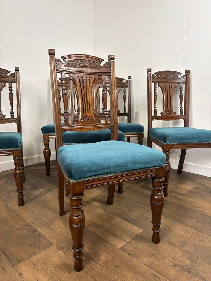 Set of Six Edwardian Carved Oak Dining Chairs –with Teal Upholstery