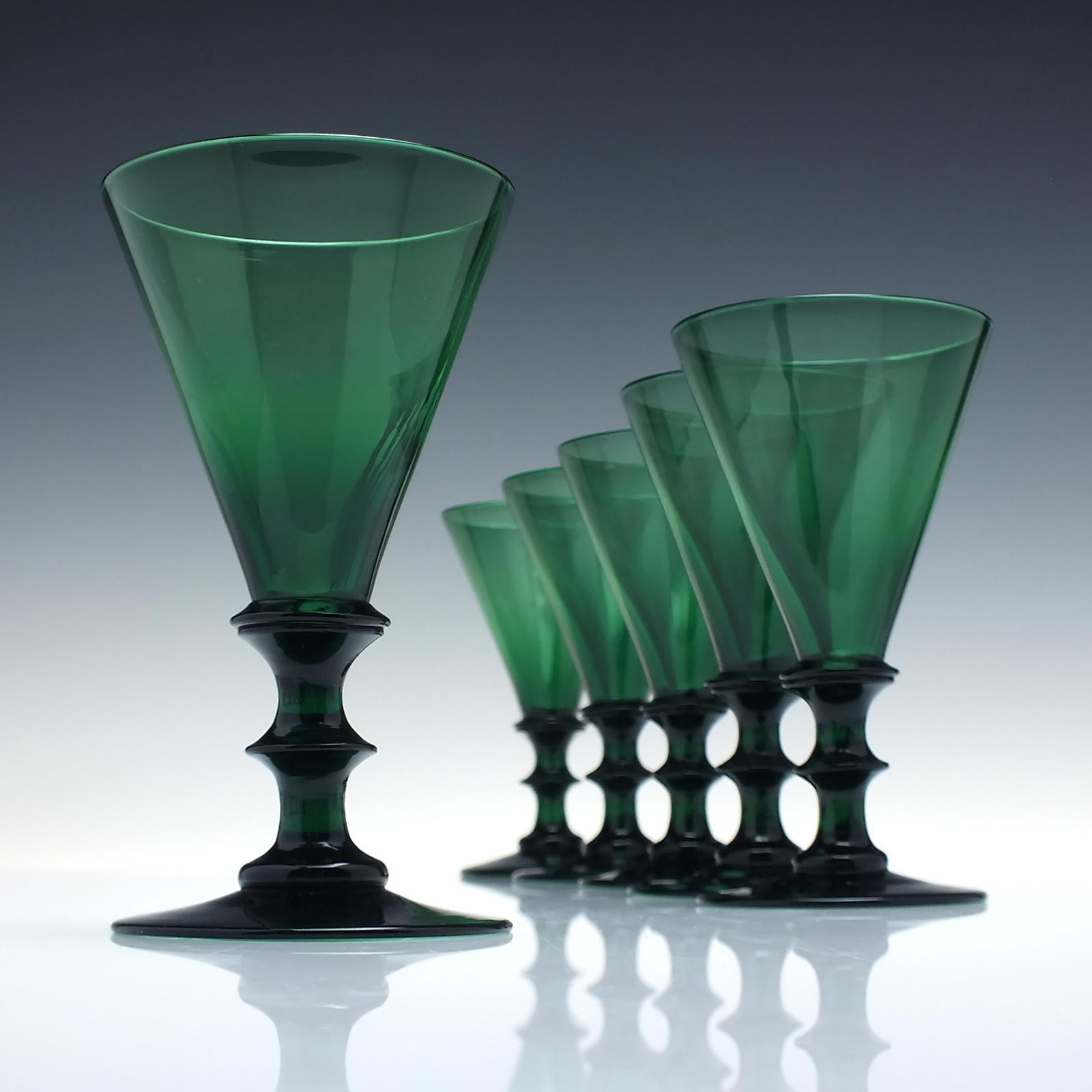 A fine matching set of six early 19th-century green wine glasses dating to c1810. They have conical bowls with annulated shoulders and angular knop stems. Conical feet with snapped pontils.