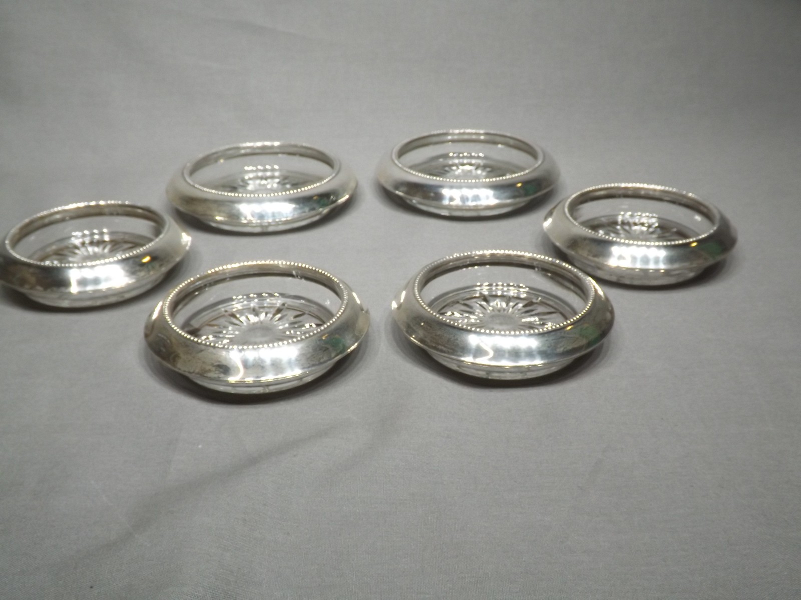 Set of Six Glass Coasters with Stirling Silver Mounts.