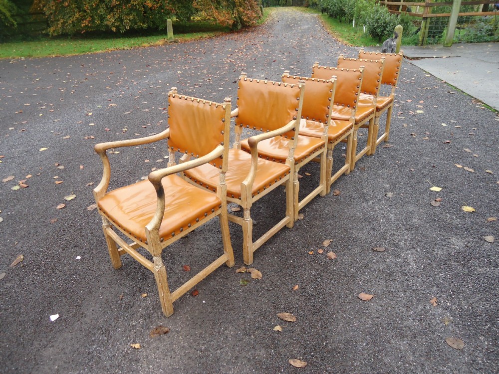 Set of Six Limed Oak Dining Chairs with Leather Upholstery (Four Plus Two Carvers)