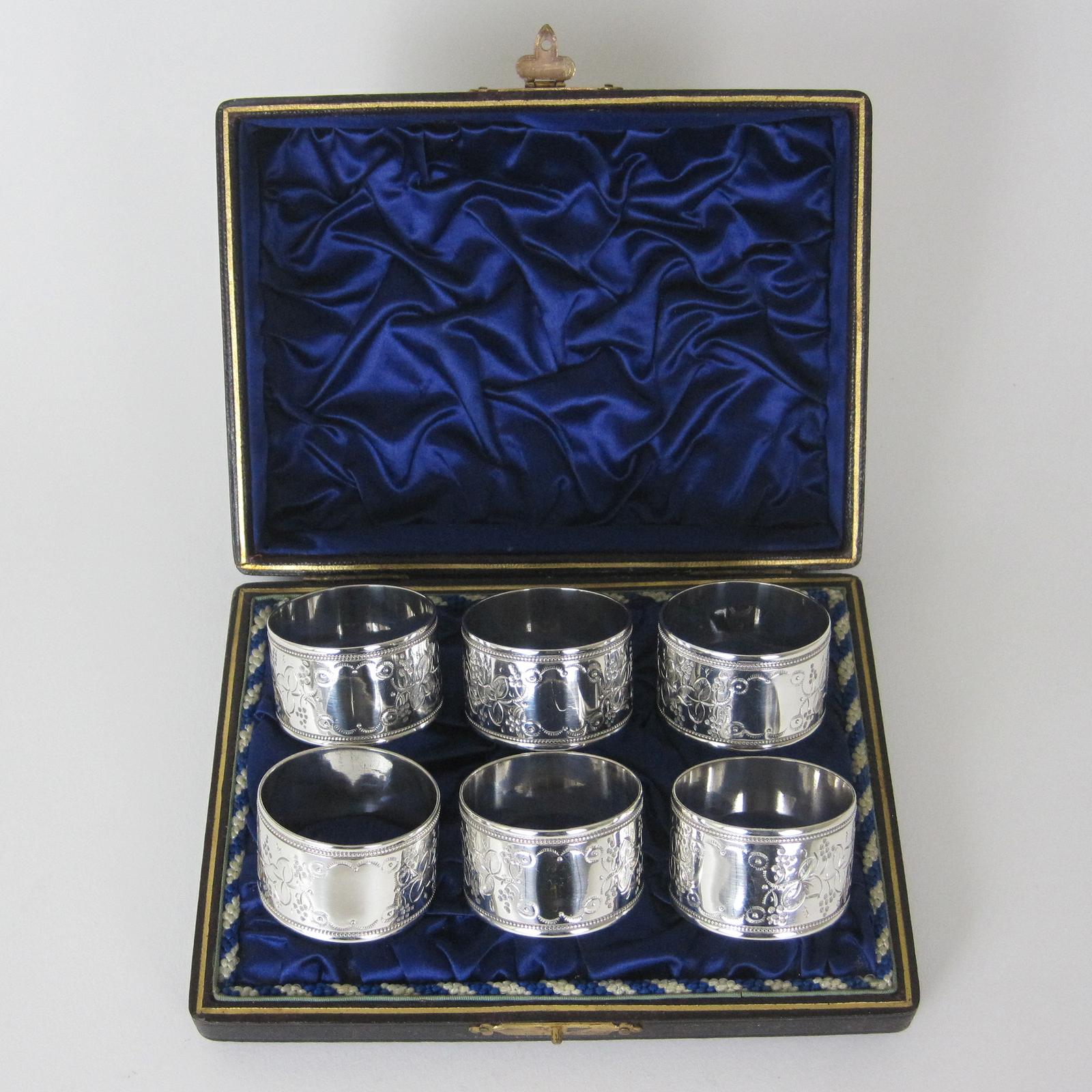 Set of Six Round Silver Plated Napkin Rings in Blue Silk Lined Box (1 of 4)