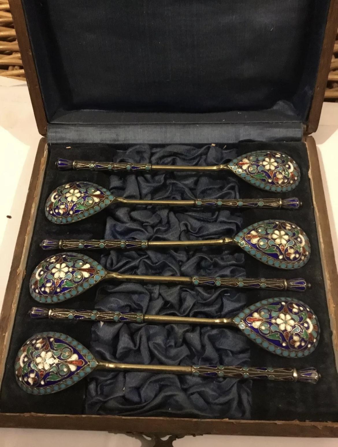Set of Six Silver Gilt Russian 1895 Cloisonné Enamel Decorated Teaspoons Cased