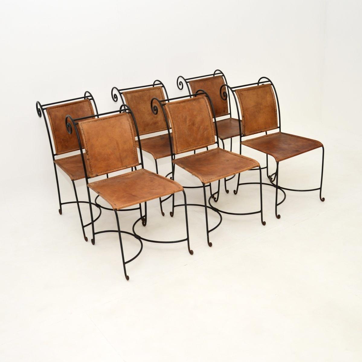 Set of Six Vintage Spanish Wrought Iron & Leather Dining Chairs