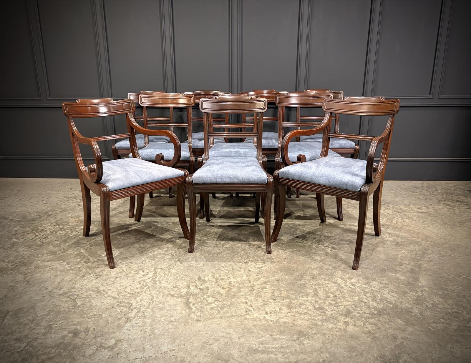 An elegant set of ten solid mahogany dining chairs, comprising two carvers and eight single chairs, of well-balanced proportions and pleasing colour throughout. The chairs feature shaped bar backs and finely curved arms to the carvers, all raised on graceful sabre legs that give the set a light, refined appearance. Each chair is fitted with a removable lift-out seat pad, upholstered in a smart blue fabric, allowing for easy re-covering if desired.