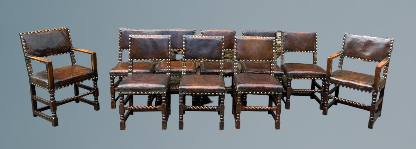 Set of Ten Oak Brass Studded & Leather Dining Chairs