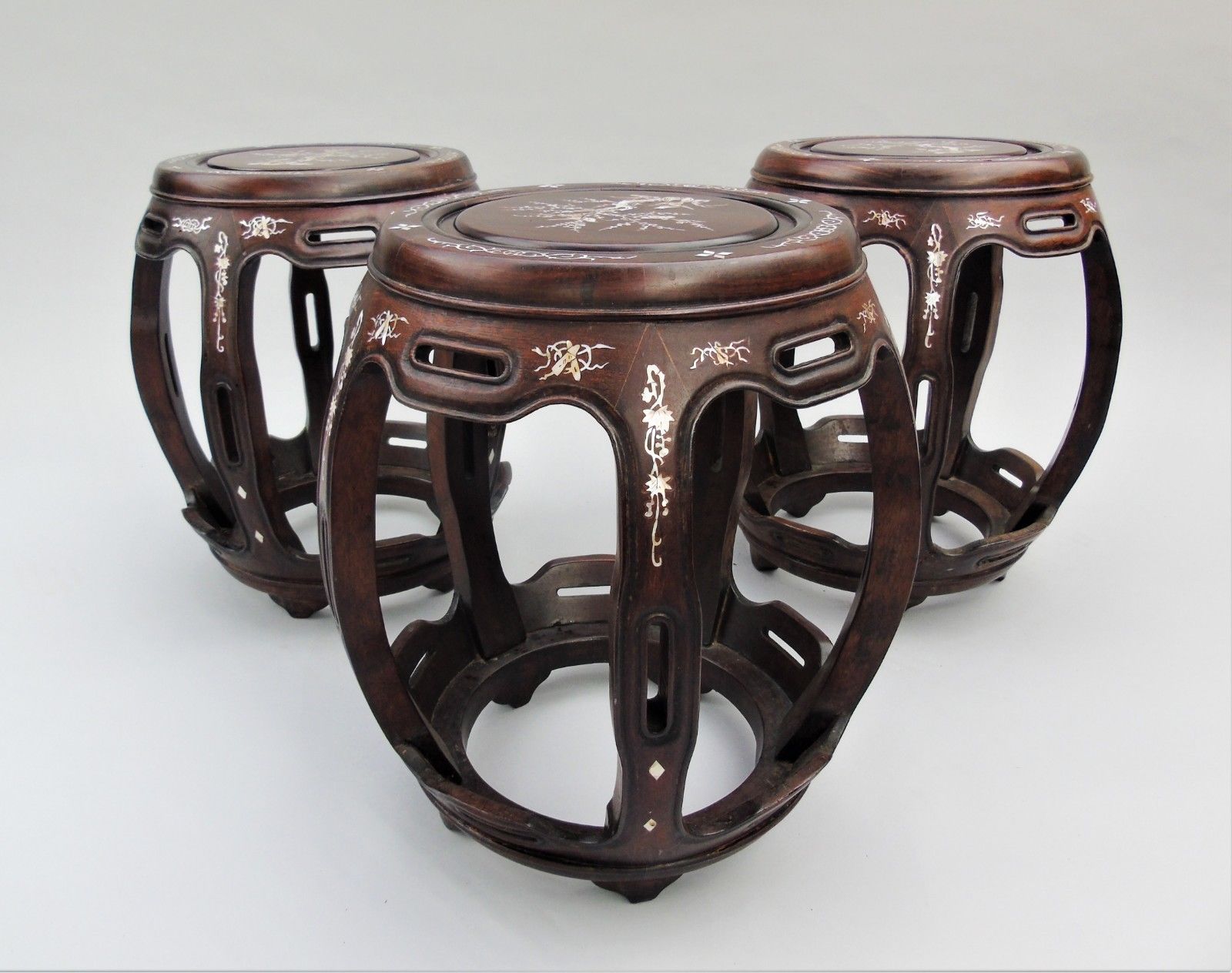 Set of Three Chinese Rosewood Barrel Stools Mother of Pearl C.1920 (1 of 5)