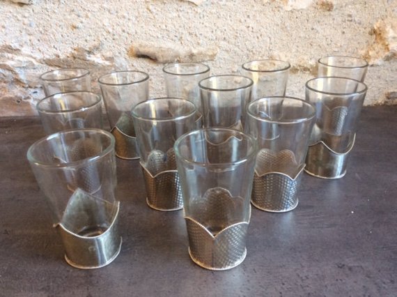 Set of Vintage 12 Moroccan Silver Wire & Galls Traditional Mint Tea Glasses