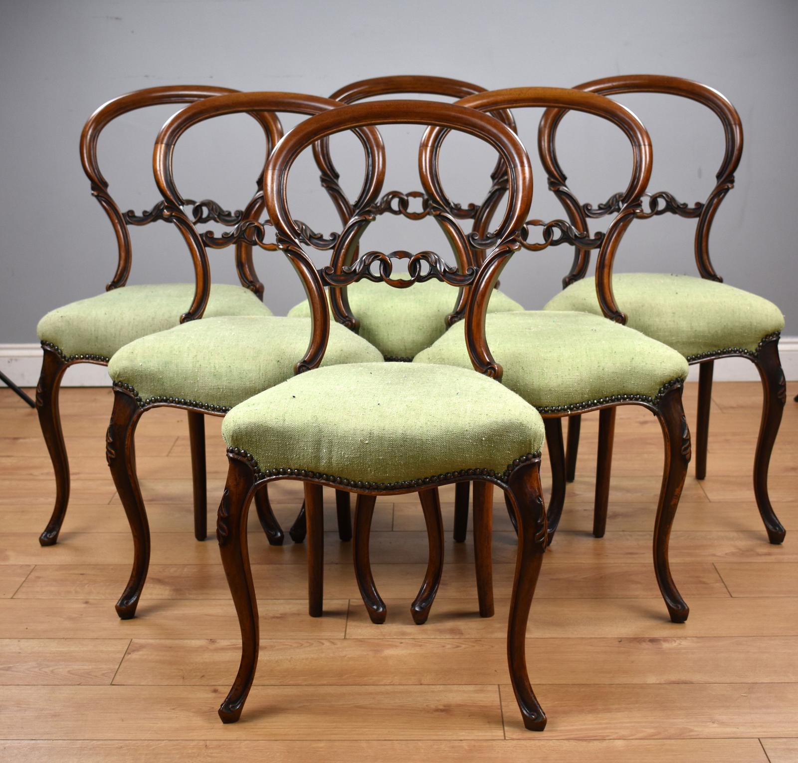 Set Six Victorian Walnut Balloon Back Dining Chairs