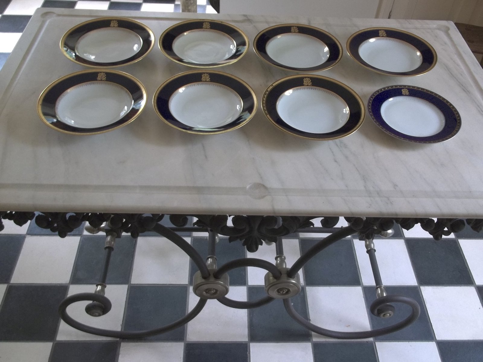 Seven Porcelain Mongrammed Cobolt Blue & Gold Leaf Bowls by Fischer & Mieg