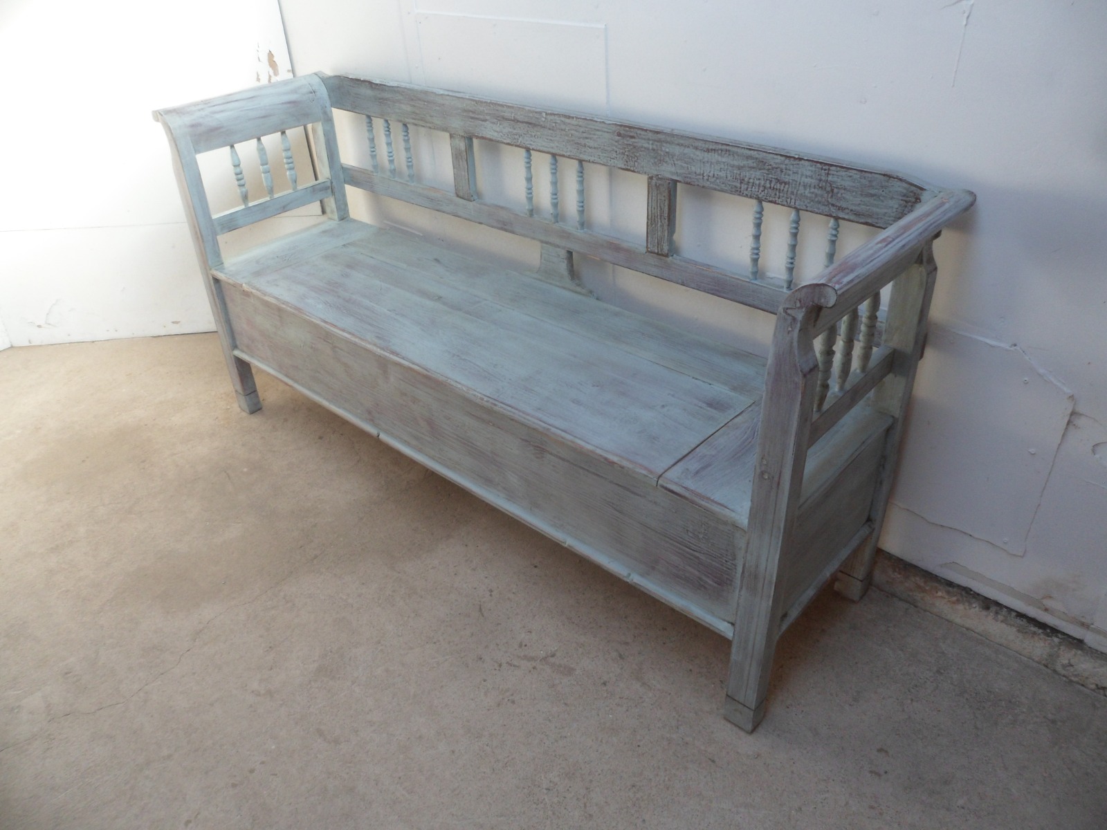 Shabby Chic Old Pine Sky Blue / Burgundy 3 Seater Box / Settle / Bench