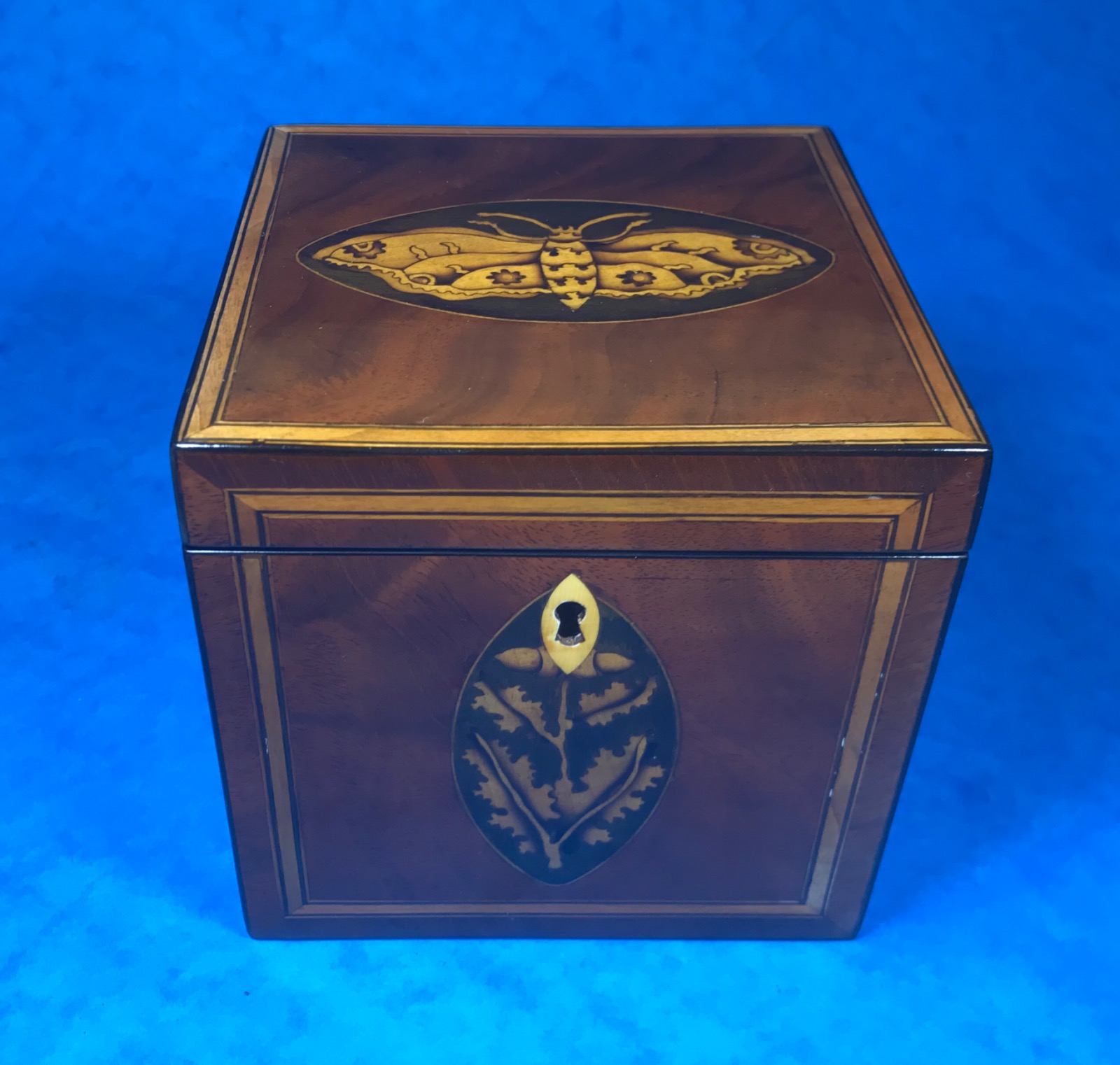 Sheraton Single Tea Caddy in Mahogany with a Beautiful Inlaid Moth