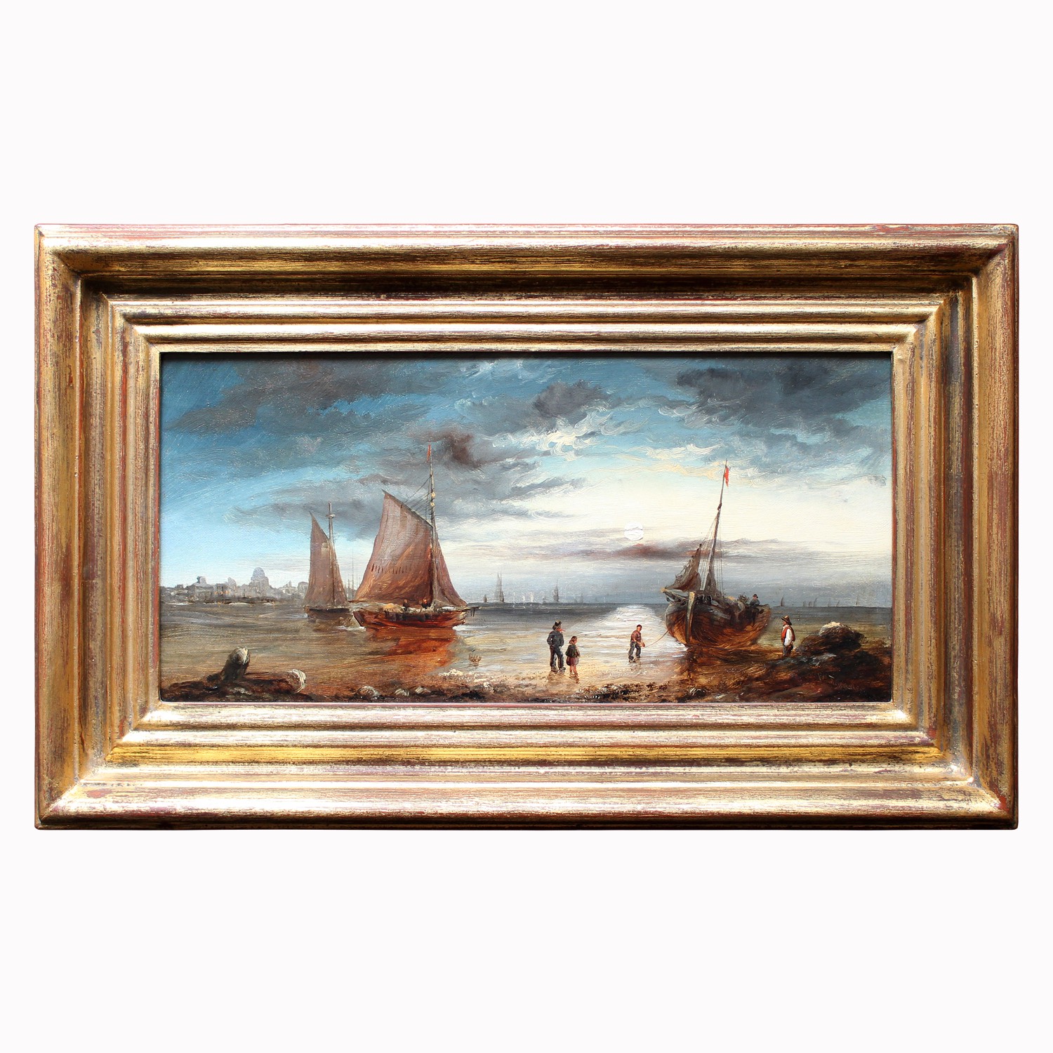 Shore Scene with Fishermen & Boats, Antique Coastal Painting, Ships, Beach