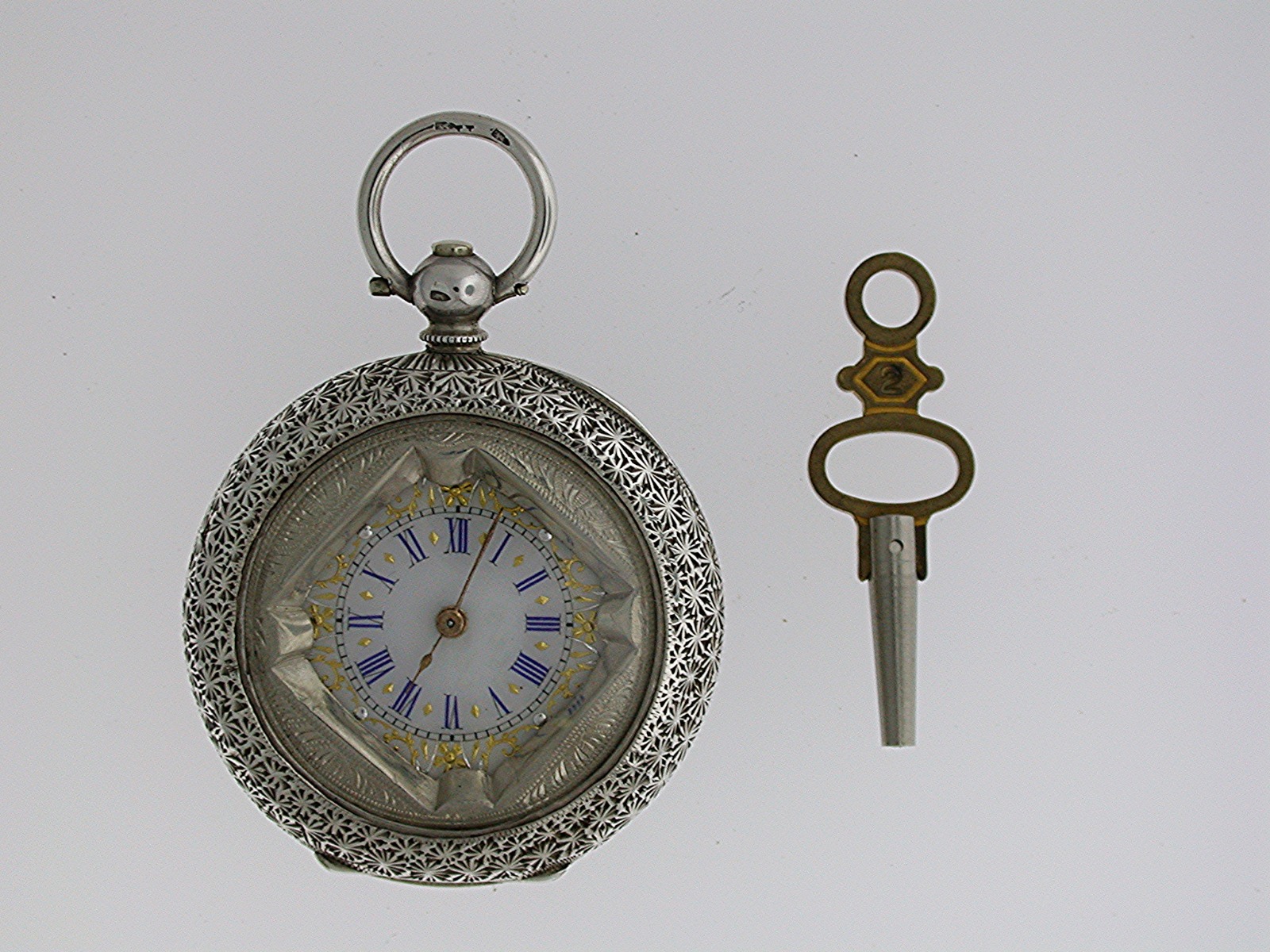 Silver 0.935 Fob Pretty Dial Engraved Keywind Open Face Pocket Watch Swiss 1880