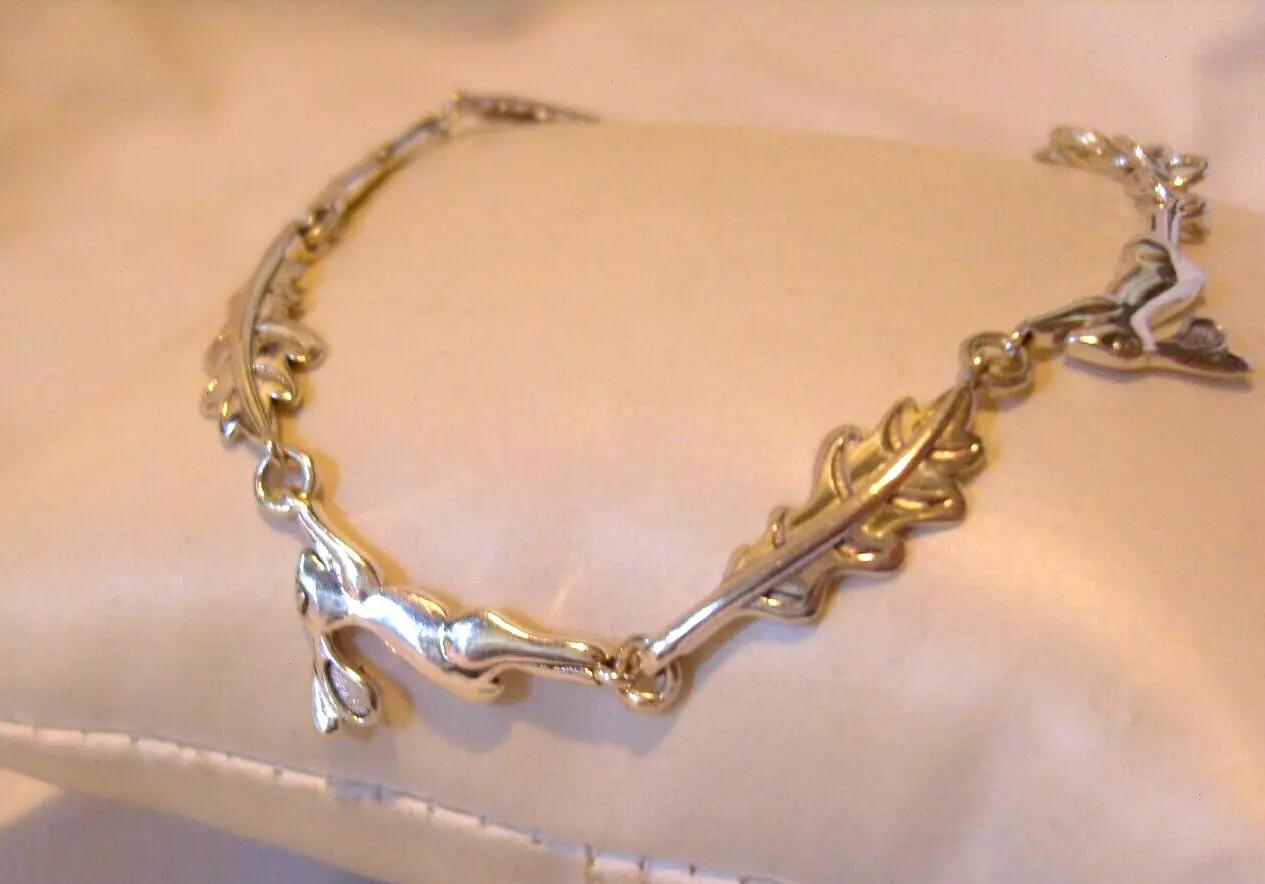 Silver Bracelet Rabbits Chasing Acorn Leaves Vintage 8 1/4" - 8 3/4" L