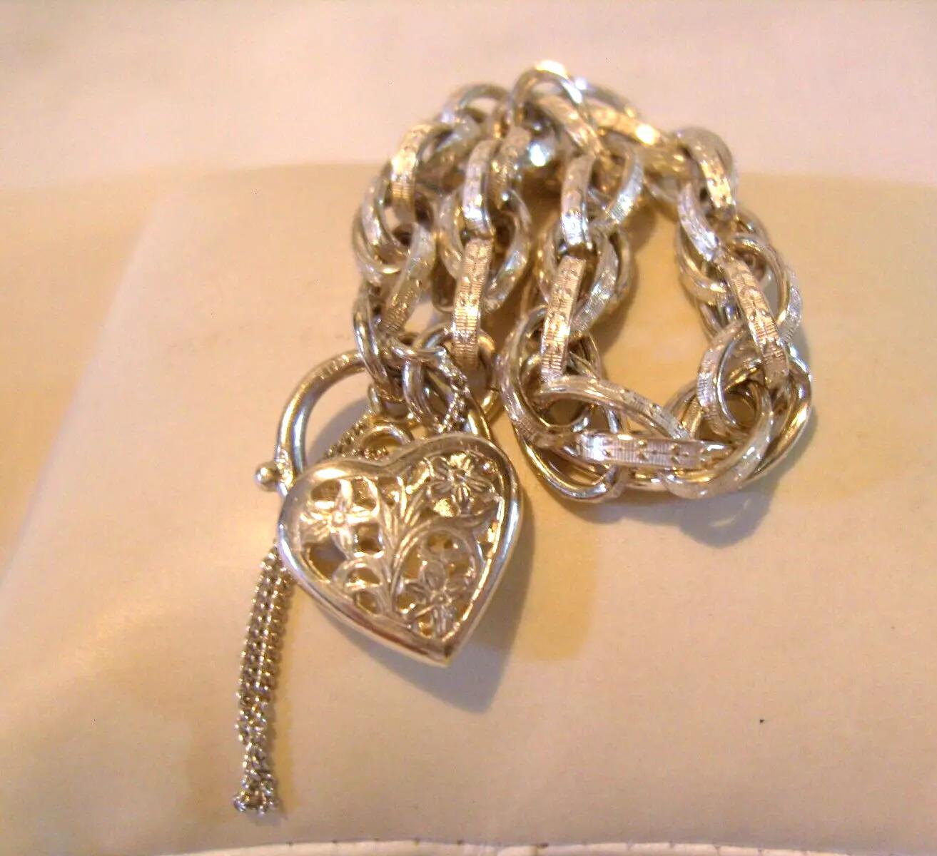 Silver Bracelet Vintage 1970s Chunky Fancy Link & Big Puffy Love Heart Padlock