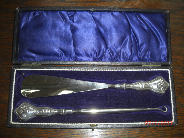 Silver Button Hook & Shoe Horn Set - Birmingham - Cased