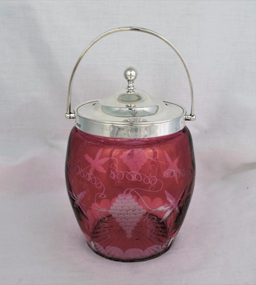 Silver & Cranberry Overlay Cut Glass Biscuit Box William Hutton
