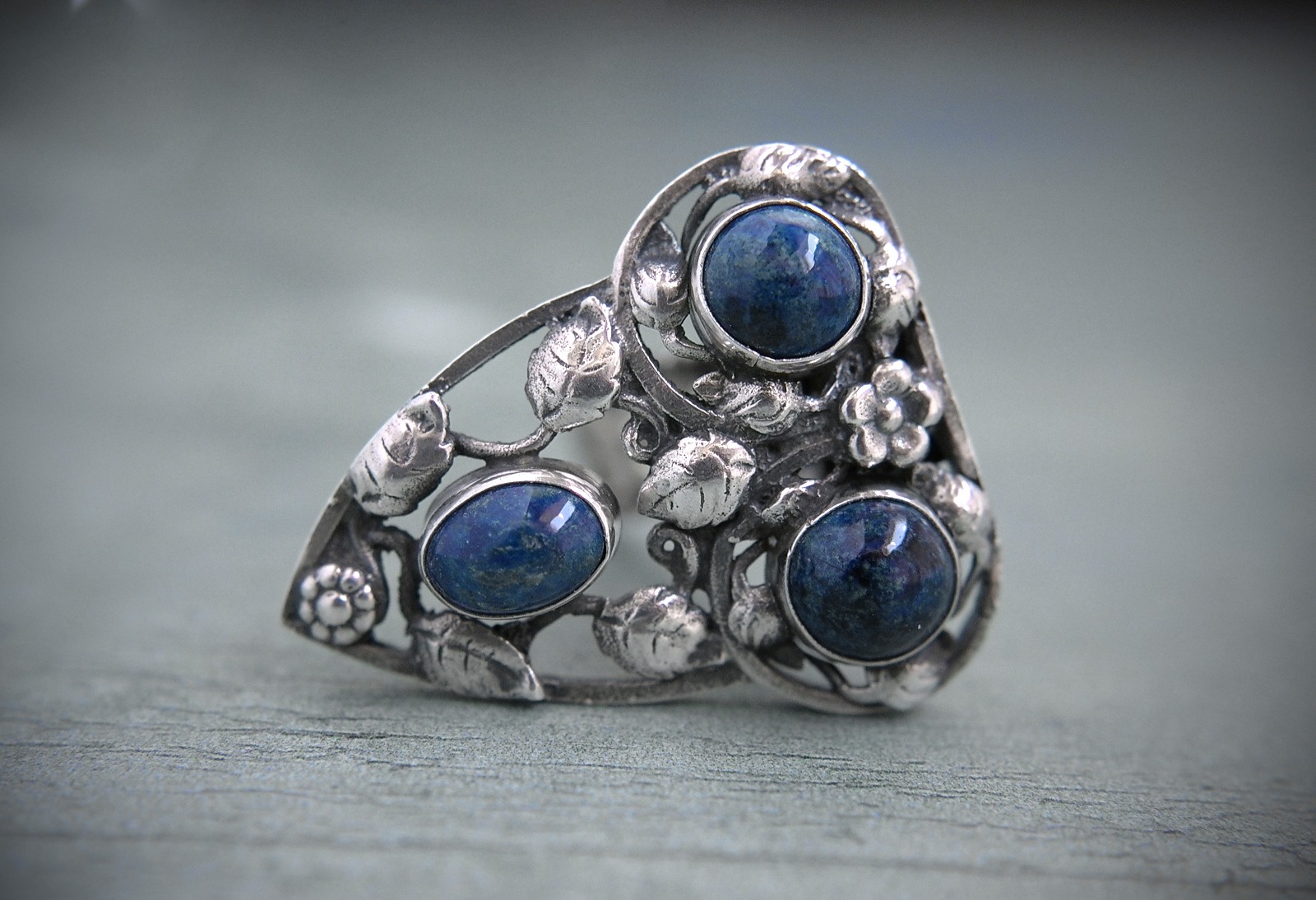 Silver Dress Clip or Brooch with Blue Dumortierite Cabochons, Vintage 1930s, Leaf Designs