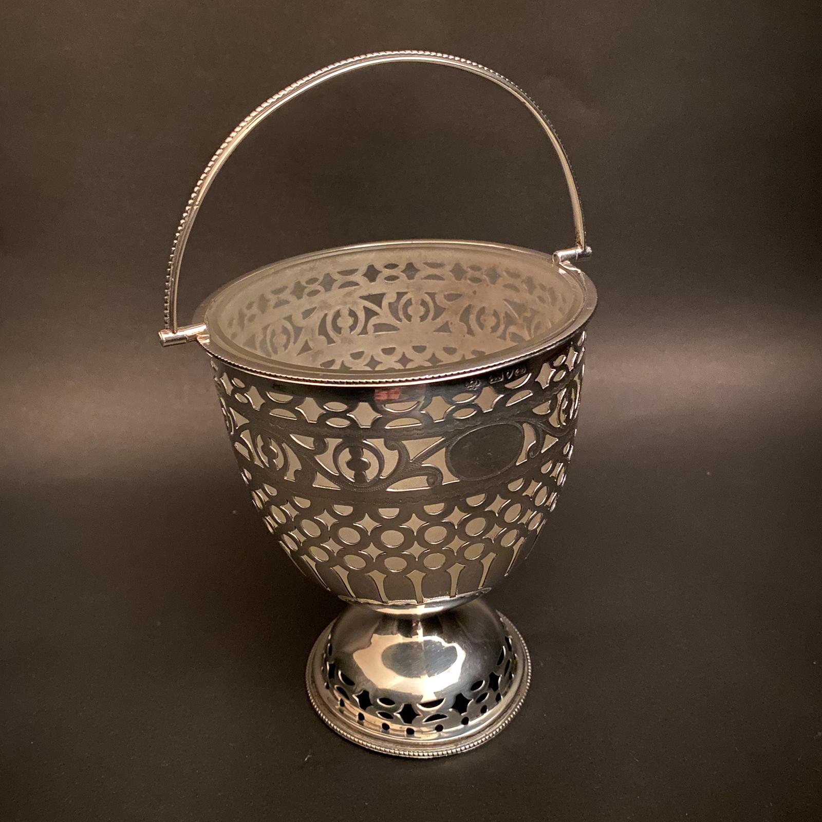 Silver Edwardian Opaline Glass Liner Fretwork Pedestal Sugar Basket