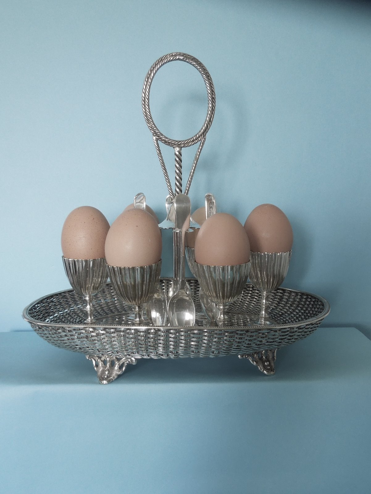 Silver Egg Cup Set, Plated. & 6 Roberts & Belk Spoons, Robert Hennell Style C.1880