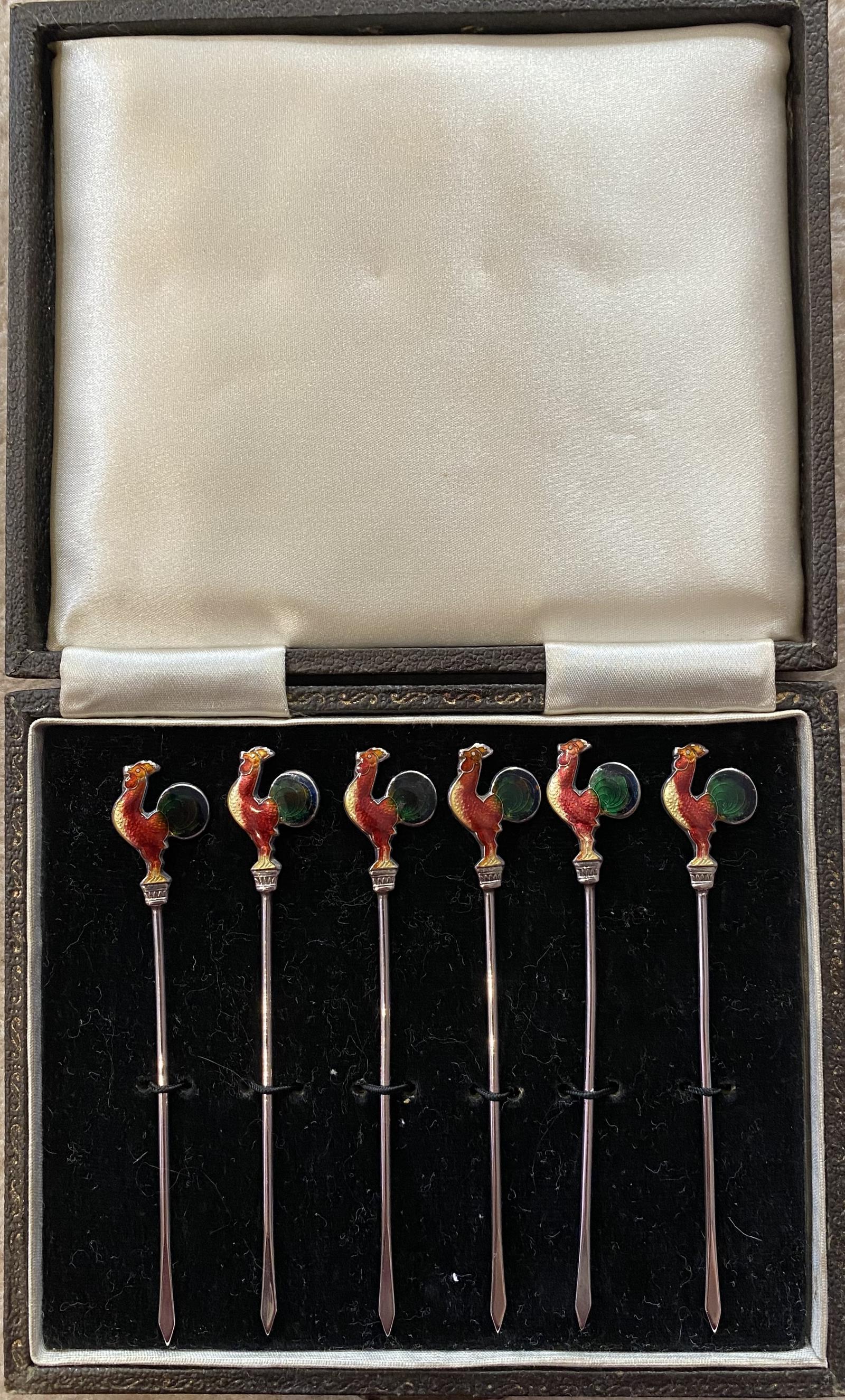 Silver & Enamel Cased Set of 6 Cocktail Sticks