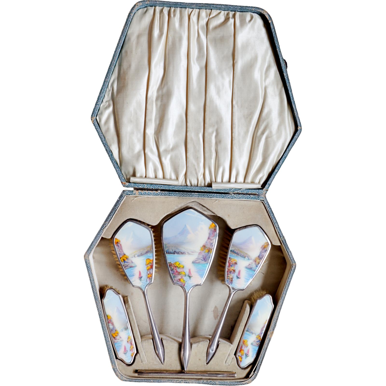 Silver & Enamel Dressing Table Set