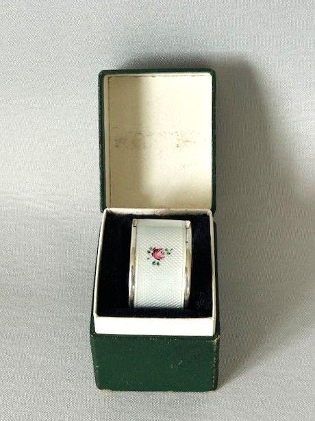 A delightful boxed German silver napkin ring. This lovely period example has a white guilloche enamel body, decorated with roses. Napkin rings make lovely gift ideas and this is a wonderful and unusual example, both practical and collectable. The base of the box has a handwritten note 'One serviette ring, silver, Angela'.