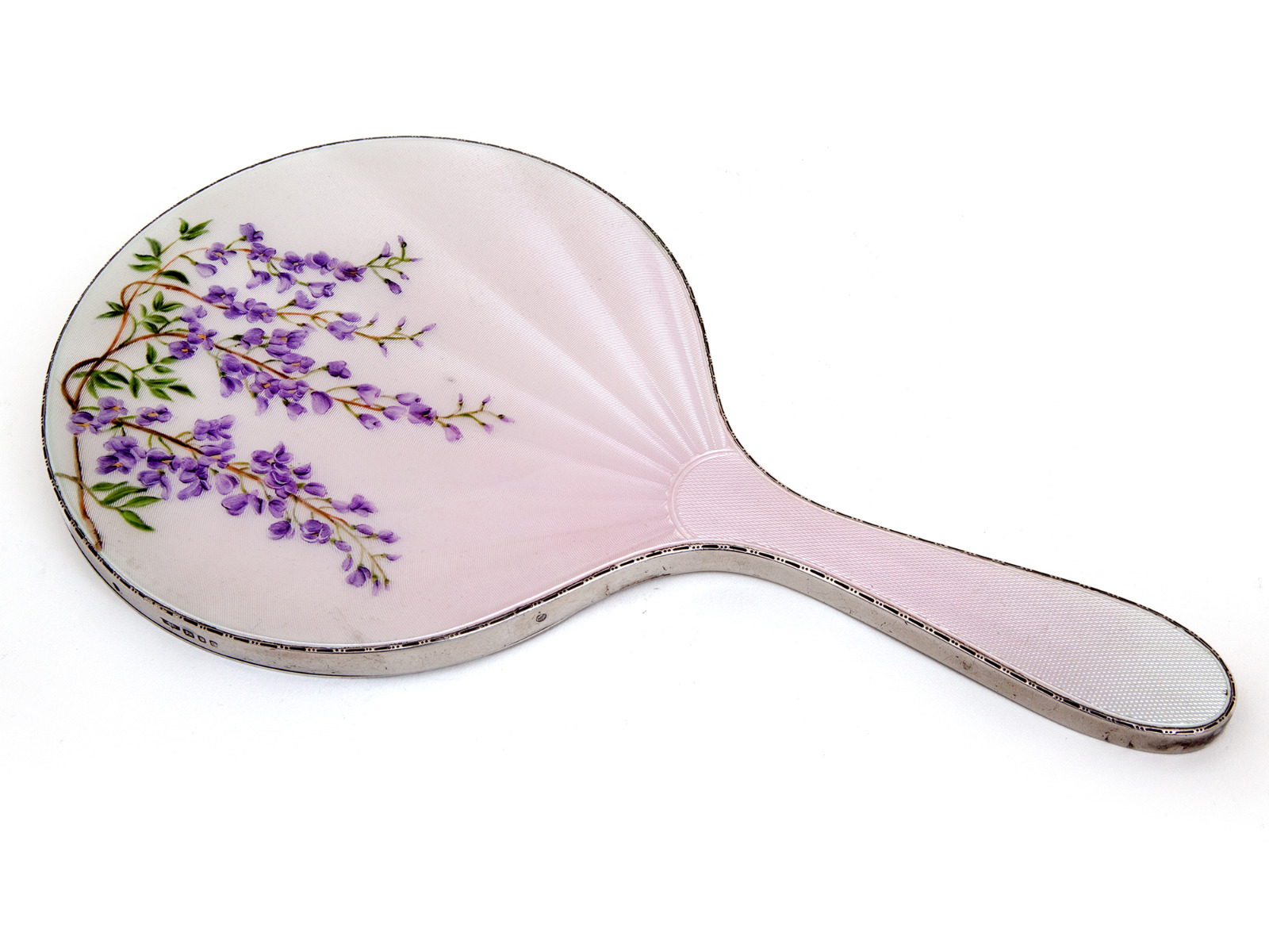 Silver Hand Mirror with a Guilloche Enamel Wisteria Branch Scene (1 of 5)
