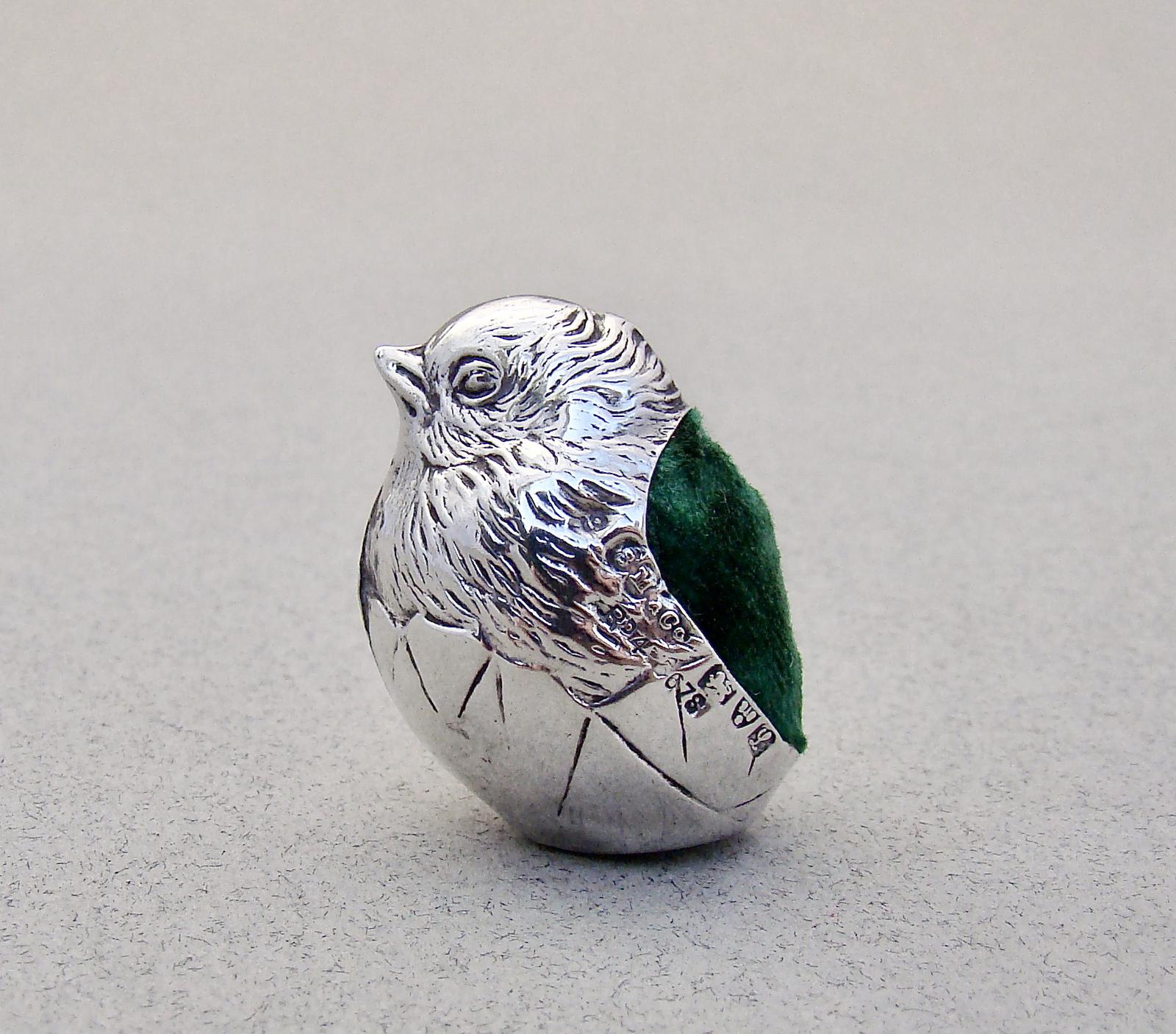 Silver "hatching chick" pin cushion by Sampson Mordan & Co, Chester 1911