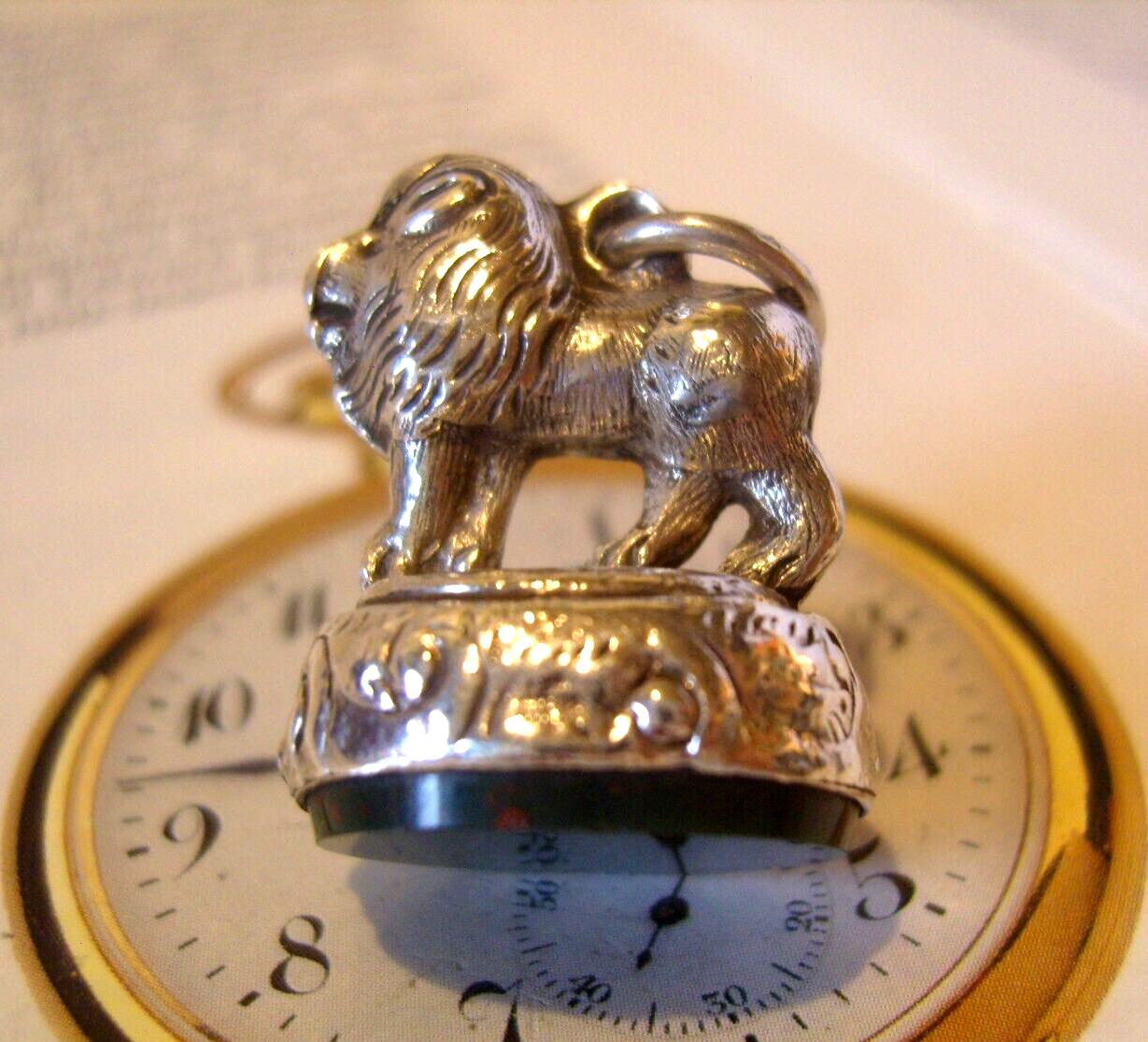 Silver Lion Fob Victorian Pocket Watch Chain Large 1890s Fob Set With Bloodstone