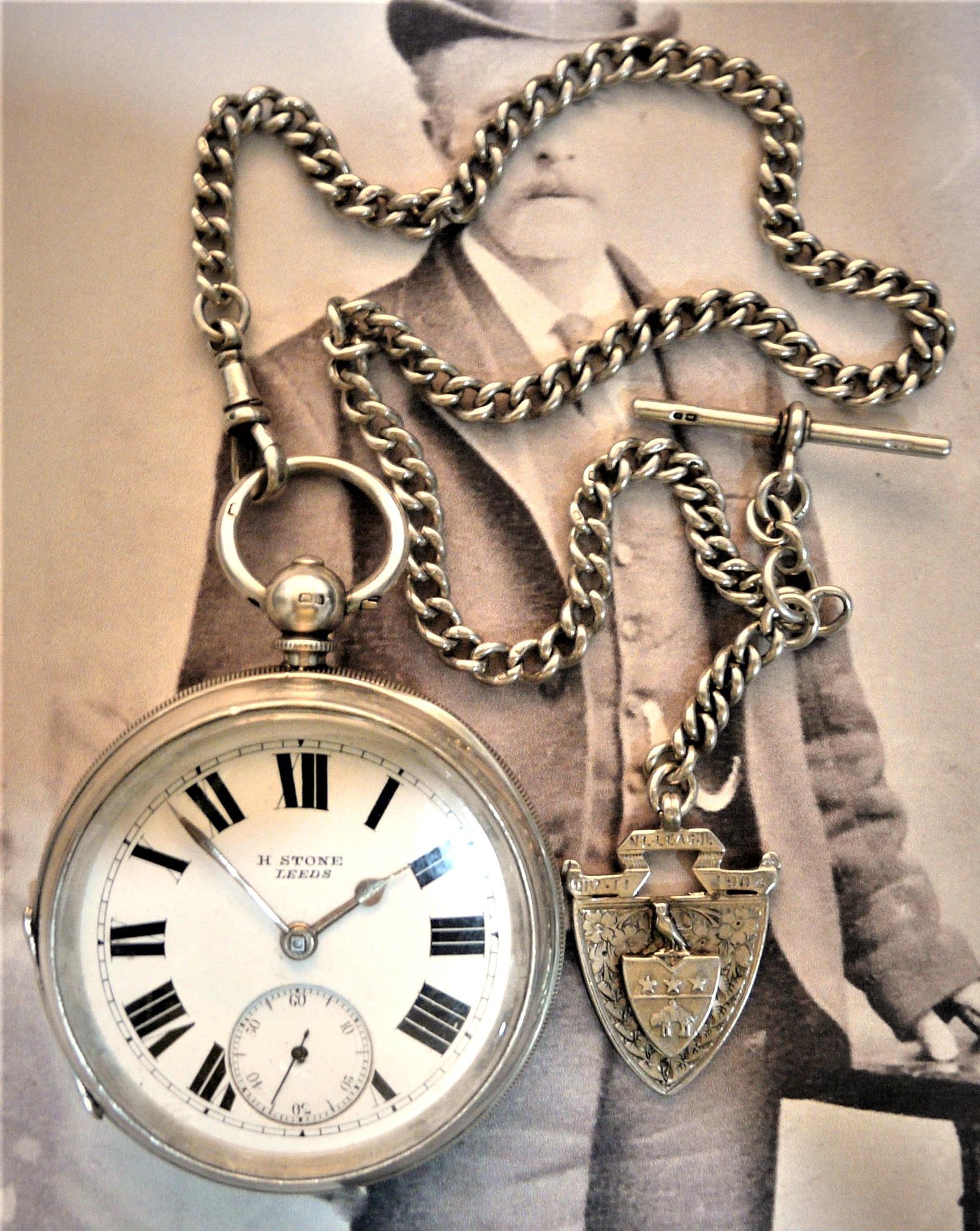 Silver Open-faced Pocket Watch Signed Harris Stone of Leeds - Hallmarked 1908 with Chain & Fob