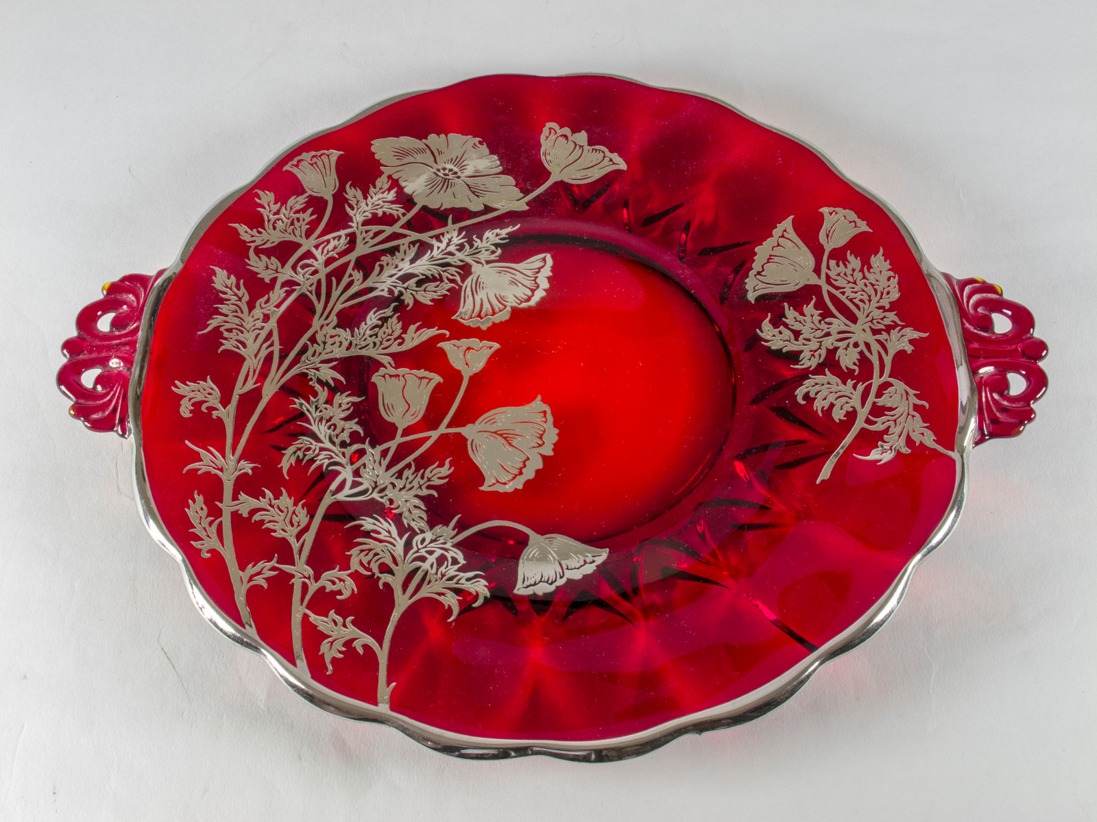 Silver Overlay Ruby Red ‘Viking Glass’ Handled Cake Plate