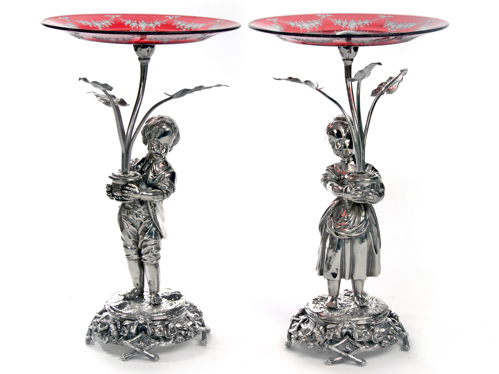 Silver Plate Boy & Girl Comports with Engraved Ruby Red Dishes