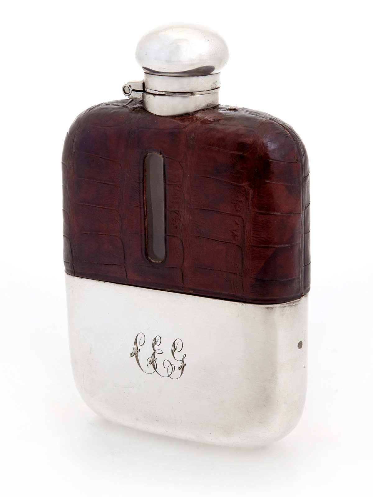 Silver Plate & Crocodile Leather Hip Flask with Removable Cup