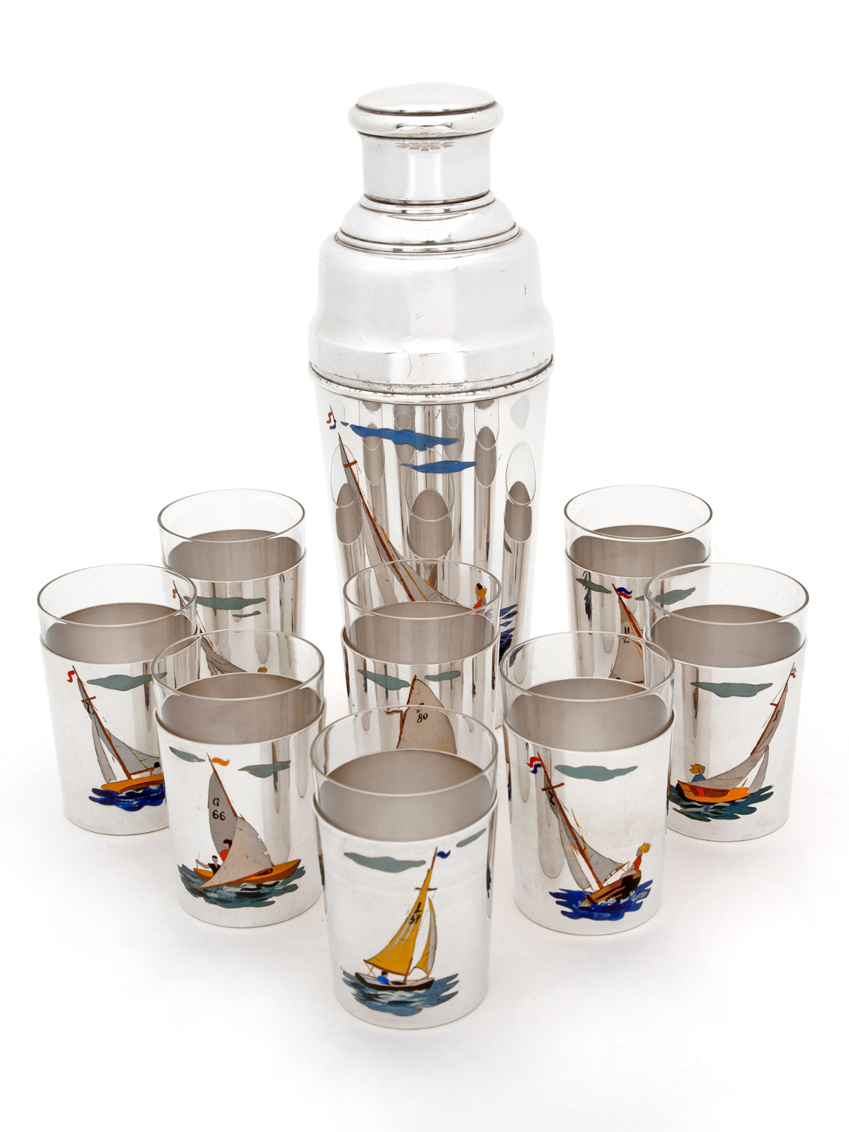 Silver Plated Cocktail Shaker and Eight Tumblers with Enamel Painted Sailing Boats