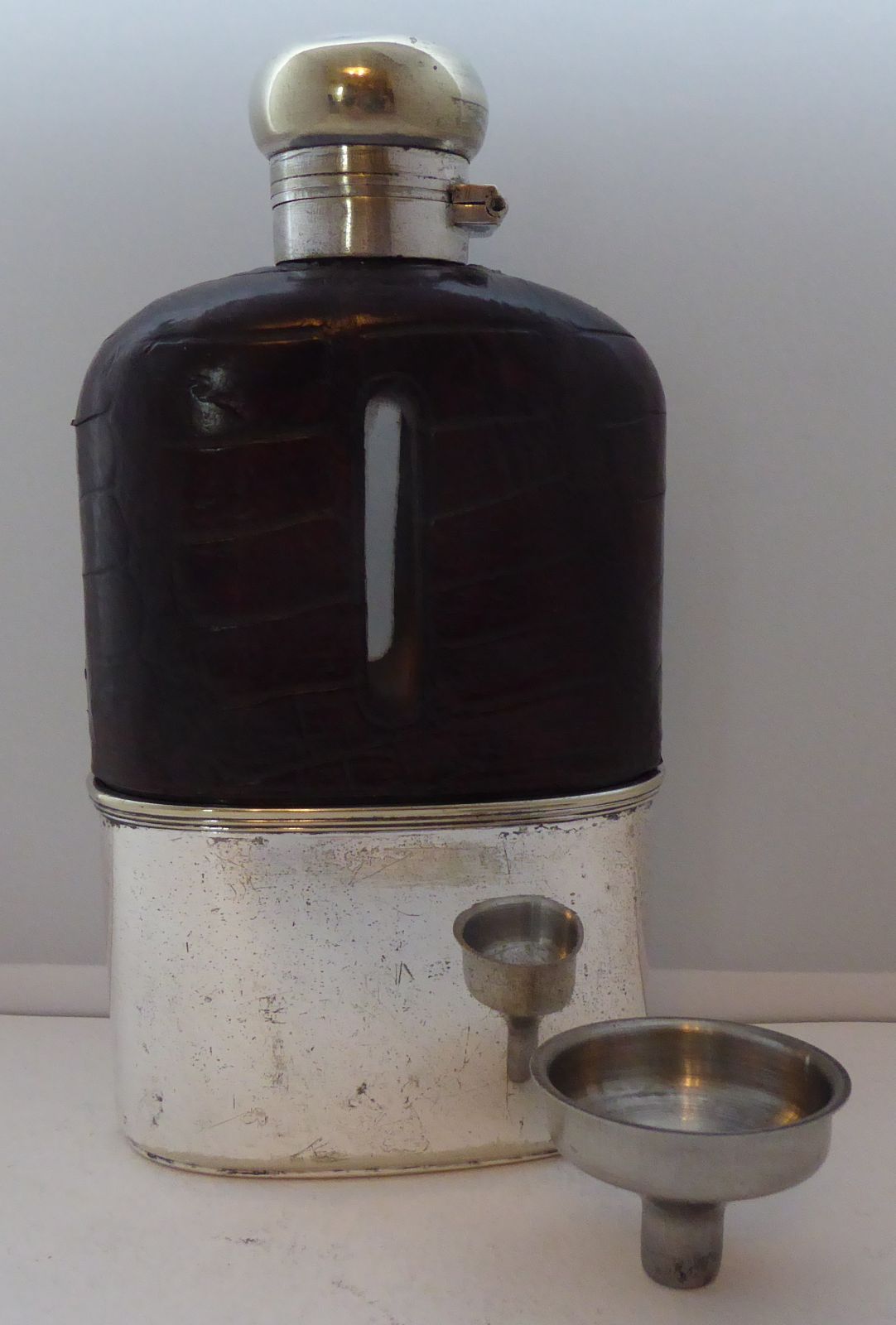 Silver Plated Crocodile Skin Bound Glass Hip Flask c.1910