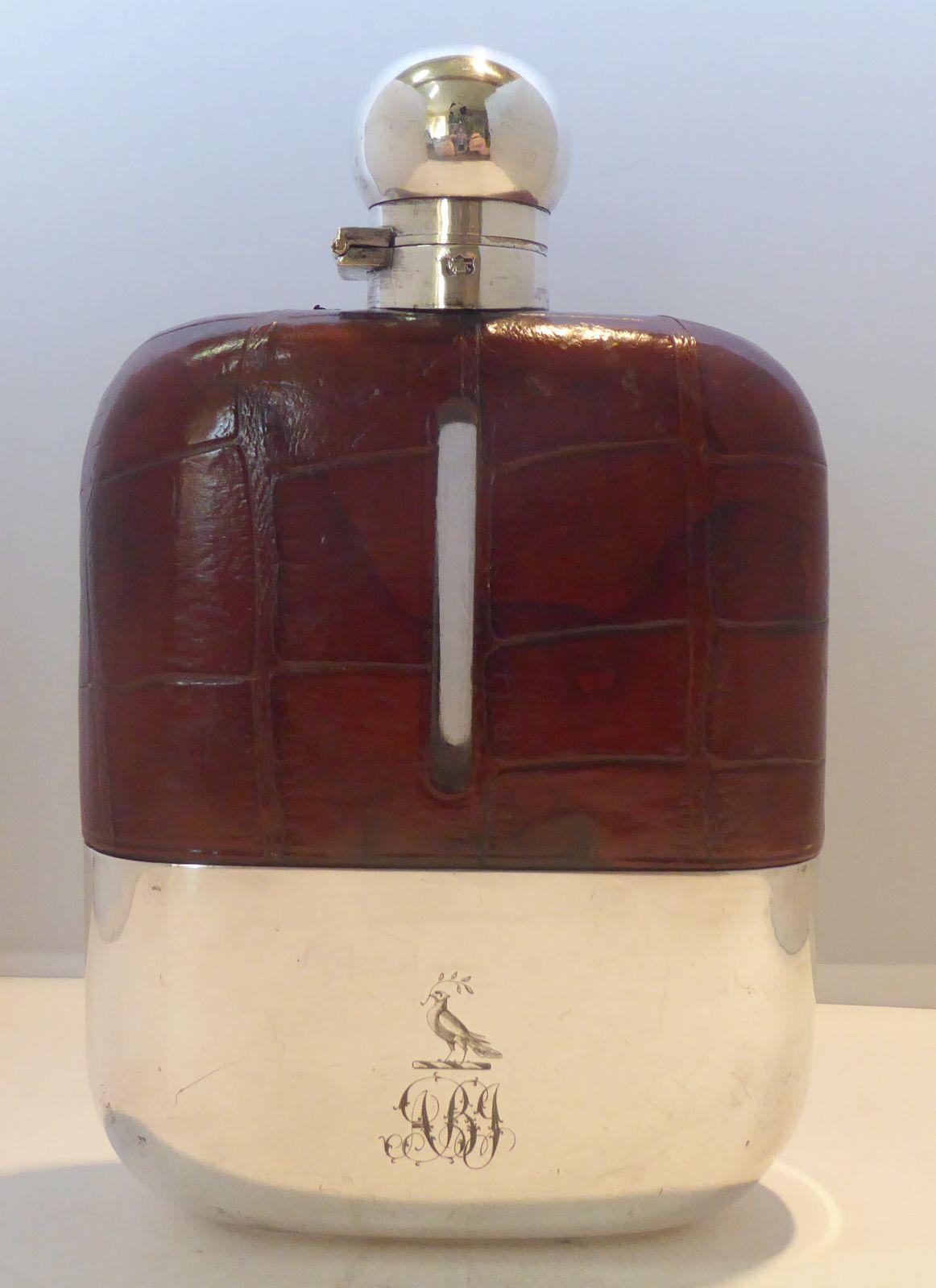 Silver Plated Crocodile Skin Bound Glass Hip Flask James Dixon 1/2 Pint c.1910