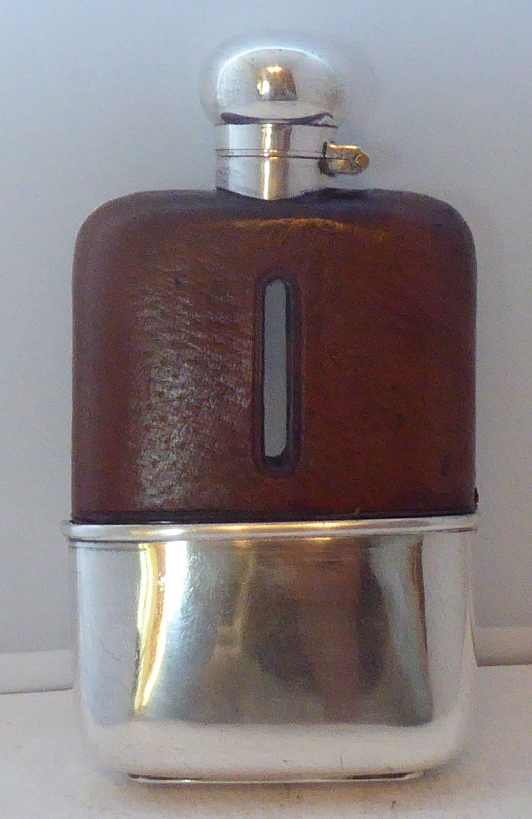 Silver Plated Leather Bound Glass Hip Flask Pig Skin c.1930