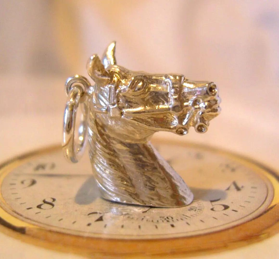 Silver Pocket Watch Chain Horse Head Fob 1960s Large Equestrian Vintage 925 Fob